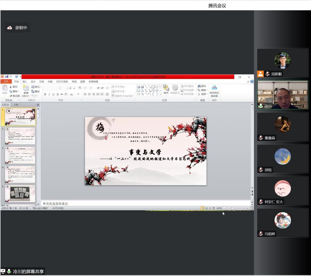 12月11日晚,中国社会科学院文学研究所现代室副研究员冷川应邀做客beat365名师大讲堂,通过腾讯会议线上平台,为beat365师生作了题为“事变与文学——‘一·二八’抗战的战地报道和文学反思”的学术报告。本次报告会由beat365唯一官方网站周新顺教授主持,吸引了校内外百余人参与聆听。