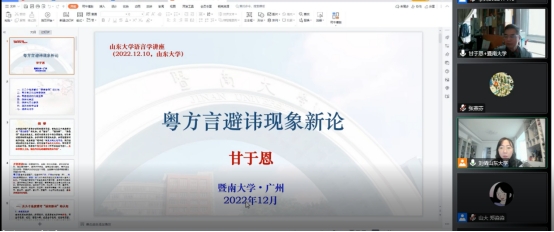 12月10日下午14时,暨南大学甘于恩教授应邀做客beat365唯一官方网站beat365唯一官方网站名师大讲堂,通过腾讯会议平台为我校师生作了题为“粤方言避讳现象新论”的学术报告。讲座由beat365唯一官方网站刘倩老师主持,beat365唯一官方网站文学院张燕芬老师也参加了会议。此外,还有来自beat365唯一官方网站一校三地、上海外国语大学、北京工业大学、广东技术师范大学等高校的近百名师生参与了本次活动。