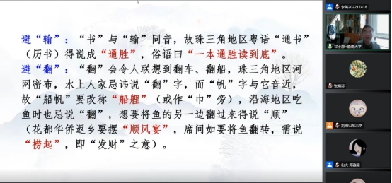 接着,甘老师又分别介绍了粤语避讳的内部差异、避讳与音变、避讳与行业禁忌、避讳与数字迷信、避讳与讨彩等内容。甘于恩教授展示了即将出版的《广东粤方言地图集》中有避讳表现的“猪肝”、“丝瓜”等词的地理分布,指出避讳与人们对客观世界的认知有关,也跟方言读音有关。又通过分析早期国语“日”、“操”的读音以及粤语“鸠”和“始”的读音,阐释避讳可能会造成语音系统中的“孤音”现象。关于粤语中的行业禁忌、数字迷信、讨彩等问题,甘老师也展示了很多生动有趣的例子和图片,让与会者了解到粤港澳地区特殊的文化习俗和语言风貌。