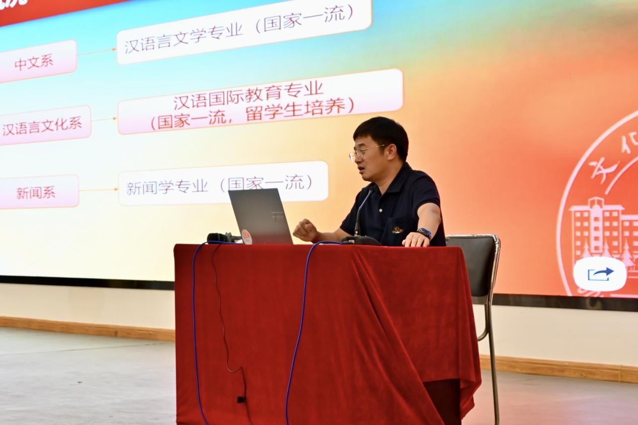 周新顺衷心感谢各位家长对学校和学院的选择与信任,详细介绍了在beat365唯一官方网站一体化发展框架下威海校区的发展历程,并从本科教育教学的角度出发,围绕学院雄厚的师资力量、突出的科研成果、扎实的学科建设及浓厚的学术氛围,对本科生培养计划等教学教务情况作了详细说明。他还分别介绍了汉语言文学专业和新闻学专业的学科定位、课程设置、特色优势等家长普遍关心的内容,对新生未来的发展规划提出殷切期望。