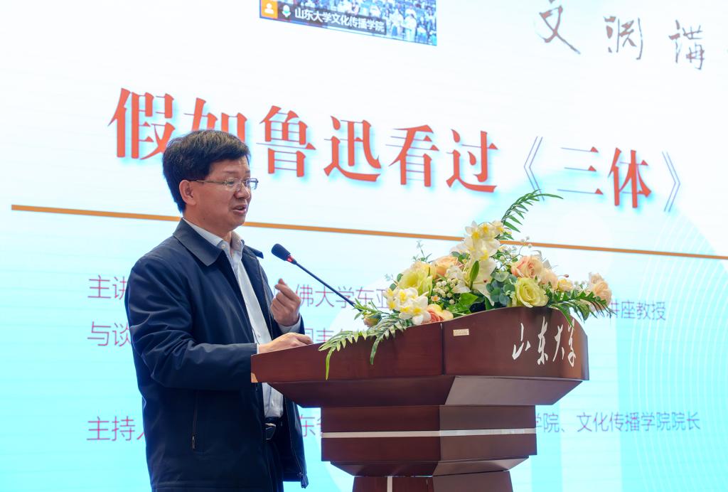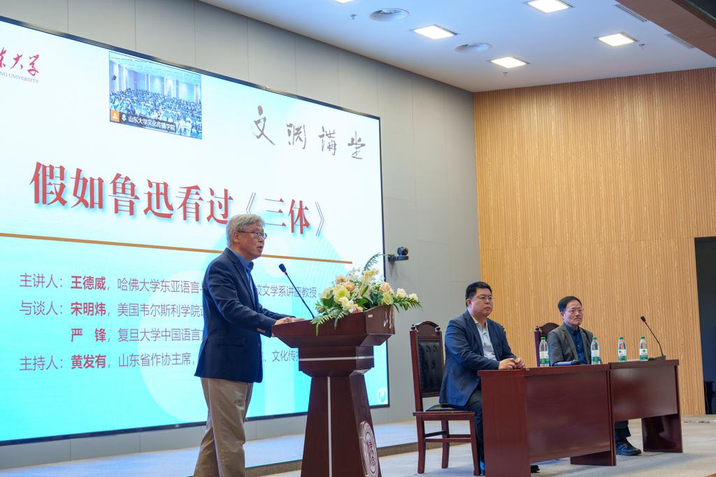 5月25日晚,美国哈佛大学讲座教授王德威、美国韦尔斯利学院讲座教授宋明炜、复旦大学教授严锋作客beat365唯一官方网站“文渊讲堂”第31期,共同为威海校区师生作了一场题为“假如鲁迅看过《三体》”的学术讲座。讲座由beat365唯一官方网站文学院、beat365唯一官方网站院长黄发有主持,beat365唯一官方网站文学院、beat365唯一官方网站师生300余人参加活动。