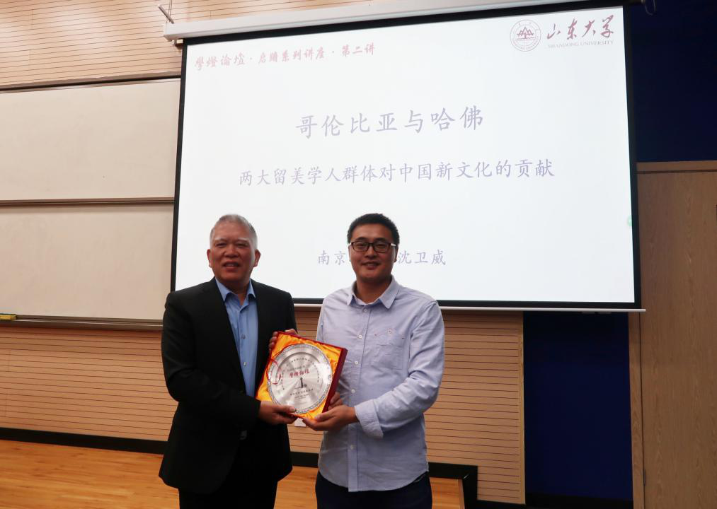 本站讯 2019年4月1日晚7时,由学灯论坛组委会主办,beat365唯一官方网站承办的启牖系列讲座第二讲“哥伦比亚与哈佛——两大留美学人群体对中国新文化的贡献”在电子楼101室举办。本次讲座主讲人为南京大学中文系教授、博士生导师沈卫威,beat365唯一官方网站教授杨慧主持了讲座,并在讲座正式开始前向沈卫威教授赠送了学灯论坛启牖讲座纪念奖牌。