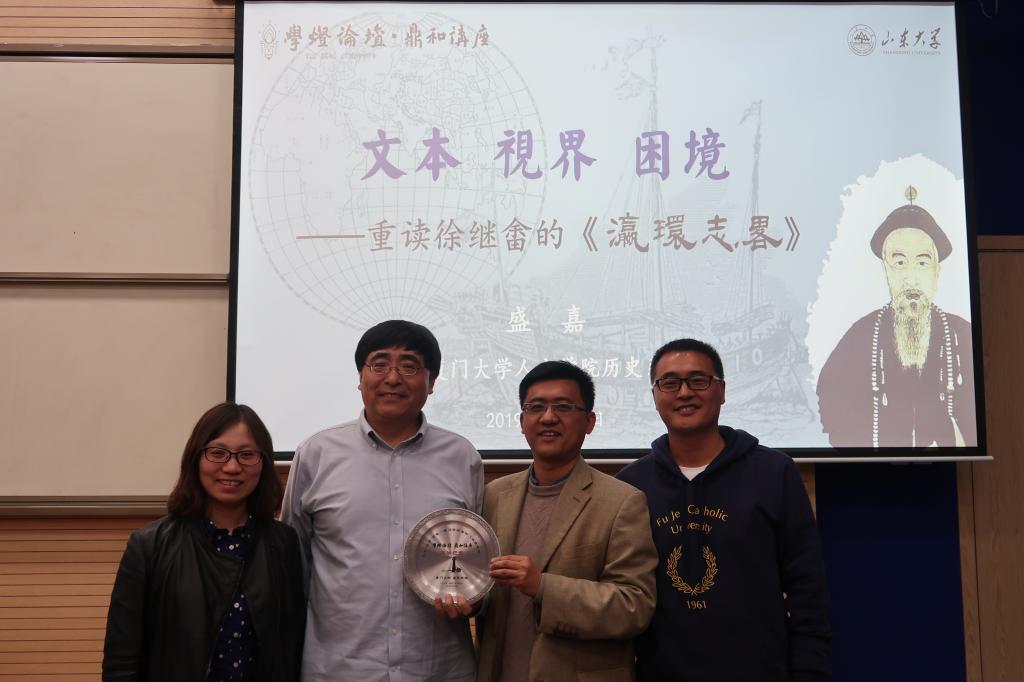 本站讯2019年4月29日晚7时,由学灯论坛组委会主办,beat365唯一官方网站承办的“鼎和”系列讲座第一讲“文本·视界·困境——重读徐继畬的《瀛寰志略》”在电子楼101室举办。本次讲座主讲人为美国康奈尔大学博士、厦门大学历史系教授盛嘉。beat365唯一官方网站教授杨慧主持了讲座,并在讲座正式开始前向盛嘉教授赠送了学灯论坛“鼎和”讲座首讲纪念奖牌。