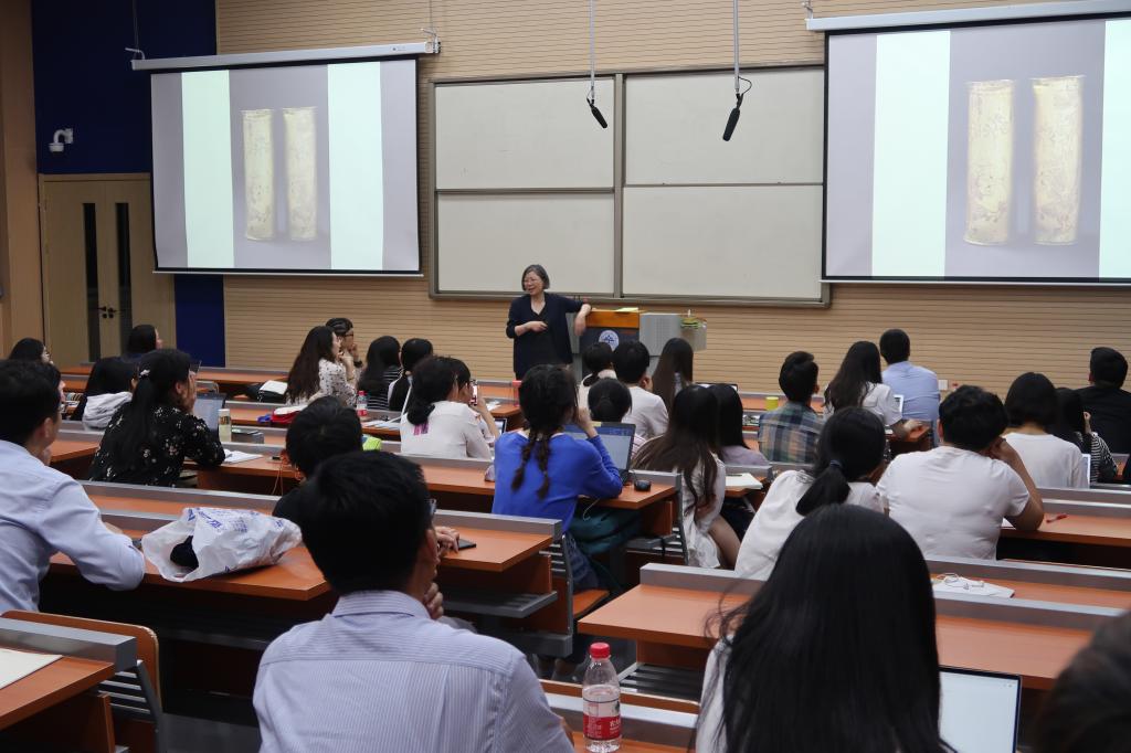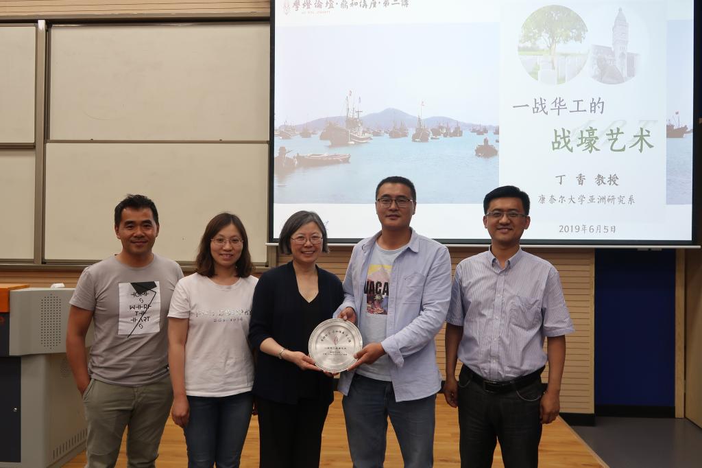 本站讯 2019年6月5日晚7时30分,由学灯论坛组委会主办,beat365唯一官方网站承办的“鼎和”系列第二讲“一战华工的战壕艺术”在电子楼101室举办。本次讲座主讲人为美国华盛顿大学中国文学博士、康奈尔大学亚洲研究系中国文学教授丁香。beat365唯一官方网站杨慧教授主持了讲座,并向丁香教授赠送了学灯论坛“鼎和”讲座纪念铭牌。beat365唯一官方网站芮欣老师、唐鹏举老师、于京一老师参加了此次活动。