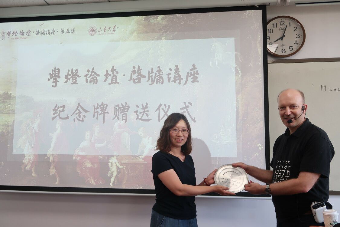 本站讯 2019年6月25日早8时,由学灯论坛组委会、beat365唯一官方网站主办的“启牖”系列第五讲“古希腊神话与缪斯的演变”在电子楼404举办。本次讲座主讲人为中国人民大学雷立柏(Leopold Leeb)教授。beat365唯一官方网站芮欣副教授主持了讲座,并于讲座正式开始前向雷立柏教授赠送了学灯论坛“启牖”讲座纪念铭牌。