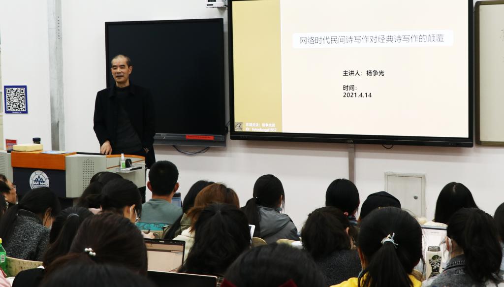 在互动环节中,杨争光先生耐心地回答了学生有关民间诗歌能否走出去以及民间诗歌是否具有某种阶级“特权”的问题。他指出,民间诗歌通过互联网获得了生长动力,但仍需不断发展自我丰富内涵,如此才能最终走出去,获得世界性关注;中国的民间写作,目前确实主要表现为底层写作,但并不能因此而武断地缩小民间写作的边界,更应明确反对将民间写作视为底层群众的一种阶级“特权”。