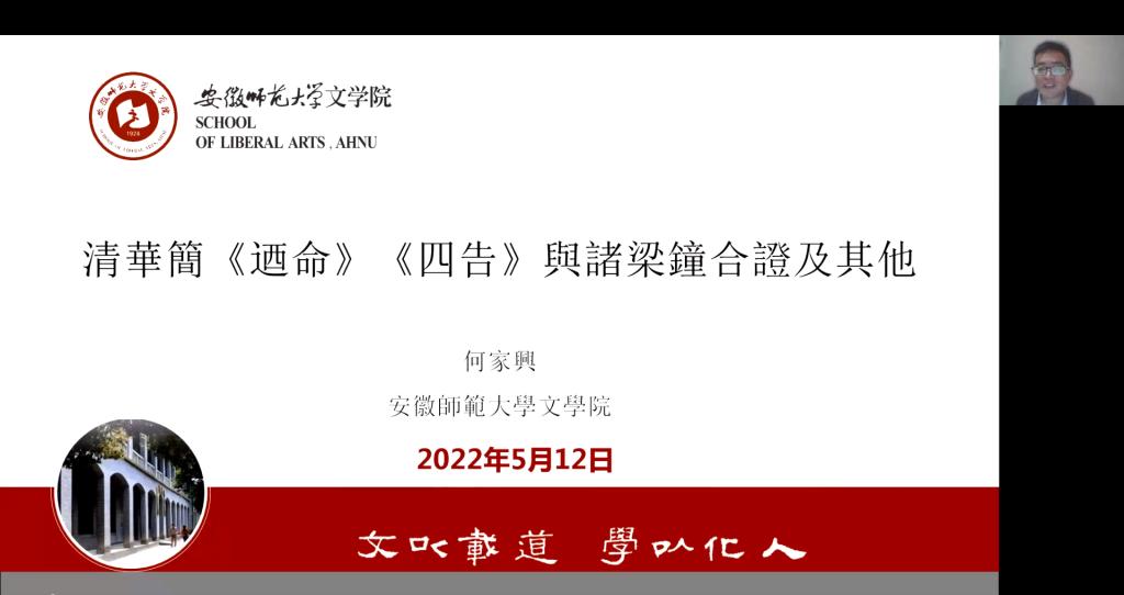 5月12日晚,安徽师范大学文学院何家兴教授应邀作客beat365唯一官方网站名师大讲堂,作了题为“清华简《迺命》《四告》与诸梁钟合证及其他”的学术报告。beat365唯一官方网站朱新林副教授主持报告会,来自复旦大学、浙江大学、中国艺术研究院、安徽师范大学、河南大学、闽南师范大学和beat365唯一官方网站一校三地师生代表等通过腾讯会议聆听了此次报告会。