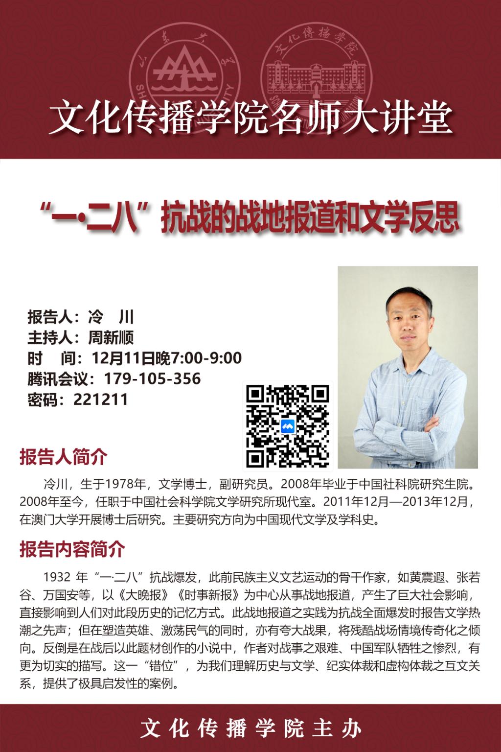 冷川,男,生于1978年,文学博士,副研究员。2008年毕业于中国社科院研究生院。2008年至今,任职于中国社会科学院文学研究所现代室。2011年12月—2013年12月,在澳门大学开展博士后研究。主要研究方向为中国现代文学及学科史。