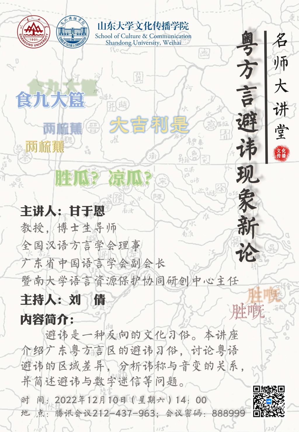 本讲座介绍广东粤方言区的避讳习俗,首先从几个角度探讨对“语言禁忌”的认知,对“避讳”、“避讳学”、“禁忌语”做基本的定义,然后论述粤方言中的言语避讳,讨论粤语避讳的区域差异,分析讳称与音变的关系,并简述避讳与数字迷信,最后指出“避讳是一种反向的文化习俗,我们在调查研究文化习俗时,往往注意显性的文化特征,即记录可以做的习俗,而忽略了隐性的习俗(不可以做的习俗)。从哲学意义上说,隐性习俗也是需要研究的习俗”。
