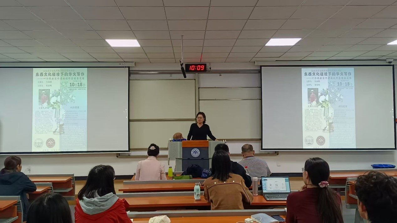 10月18日上午,欧洲华文笔会会长、著名作家方丽娜应邀做客beat365唯一官方网站beat365唯一官方网站名师大讲堂,主讲“东西文化碰撞下的华文写作——一个旅欧写作者的创作历程与感悟”。本次讲座由beat365唯一官方网站beat365唯一官方网站崔春教授主持,学院师生共同聆听了此次讲座。