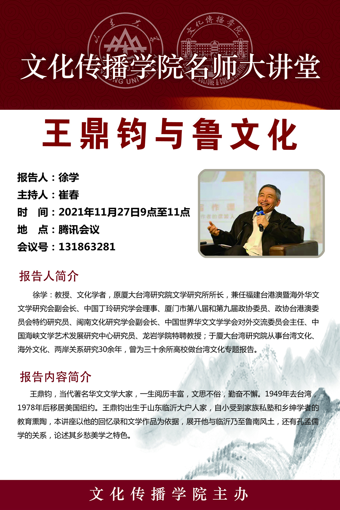 王鼎钧,当代著名华文文学大家,一生阅历丰富,文思不俗,勤奋不懈。1949年去台湾,1978年后移居美国纽约。王鼎钧出生于山东临沂大户人家,自小受到家族私塾和乡绅学者的教育熏陶,本讲座以他的回忆录和文学作品为依据,展开他与临沂乃至鲁南风土,还有孔孟儒学的关系,论述其乡愁美学之特色。