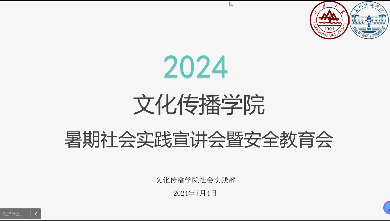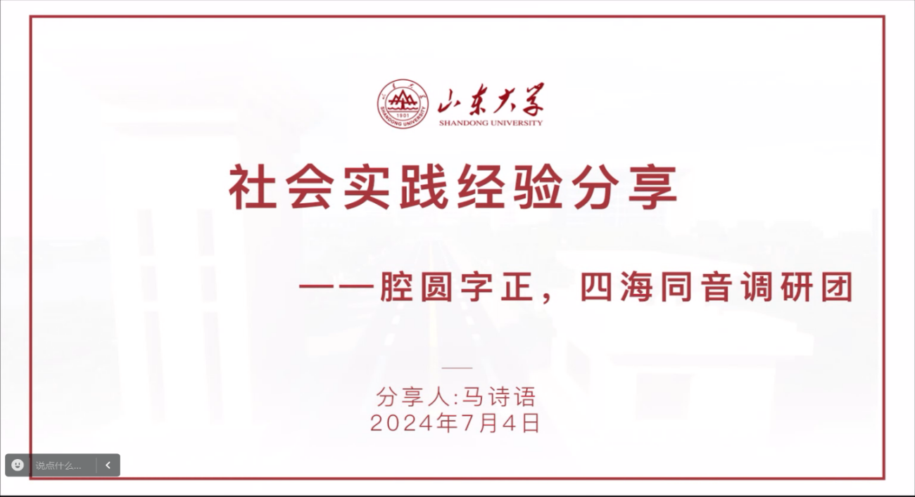 本次会议分为社会实践基本情况概述、经验分享、安全培训和问题答疑四个环节。宁权首先简要介绍学院社会实践的总体概况和基本流程。“腔圆字正,四海同音”调研团队队长马诗语结合自身经历,交流实践日程安排、报告撰写及答辩等方面的经验。“爱的三角”支教团队长李子硕梳理了近年来团队的选题变化,提出结合国家号召、时政热点细化选题的建议。在安全培训环节,朱慧敏针对社会实践可能面临的安全问题进行了详细的讲解,并解答实践投稿宣传、实践过程记录、实践初心与实践目标等问题。