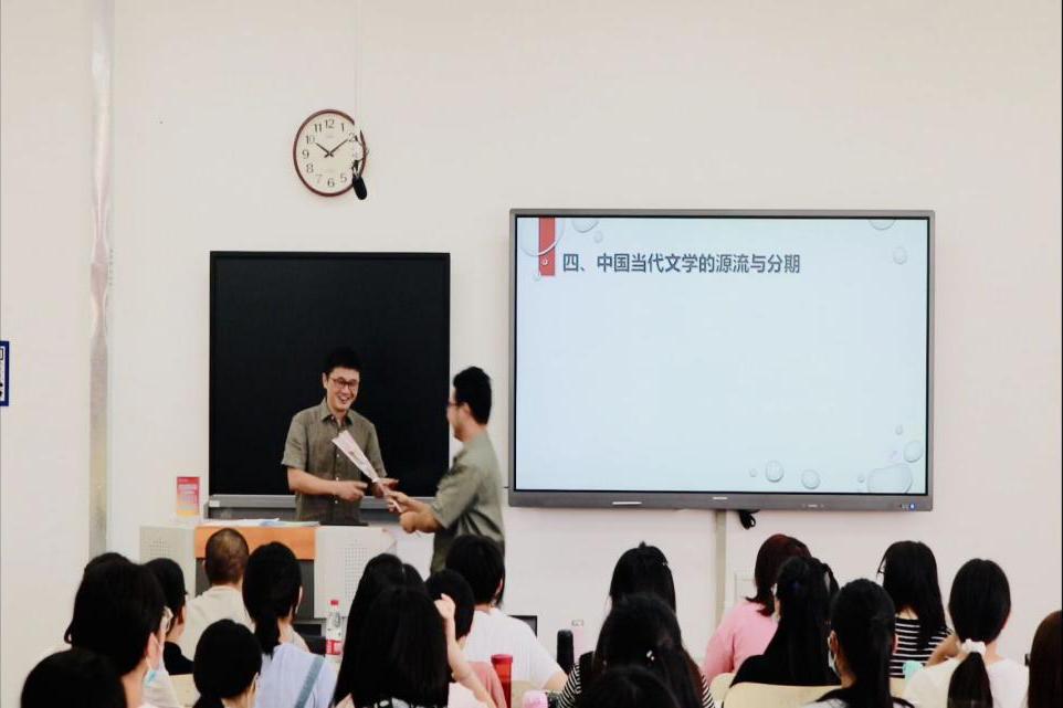 上午,学院学生代表到达文学楼,依次去到院办公室、书记办公室、留学生管理办公室等各个办公室问候教师,并赠送鲜花和贺卡,传达来自全院学生诚挚的祝福和感谢。在海洋学院502教室进行的电视新闻学课堂上,全班同学向任课教师张超送出教师节祝福。下课铃响起,在班长王凤仪发出“起立”口令后,全体同学起立齐声说道“祝老师教师节快乐”,并由包鹏敏作为代表向任课教师张超送上鲜花,张超表示这是一个特别的惊喜。今天的各个课堂中,学院同学们都向各自任课老师表达了教师节节日祝福。