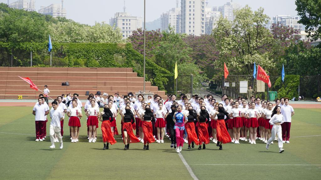 本站讯 5月19日中午,校区第十四届团体操比赛在田径运动场举行。beat365唯一官方网站党委副书记周玉宏受邀担任评委,学院团体操成员参加比赛,广大学子前往加油助威。