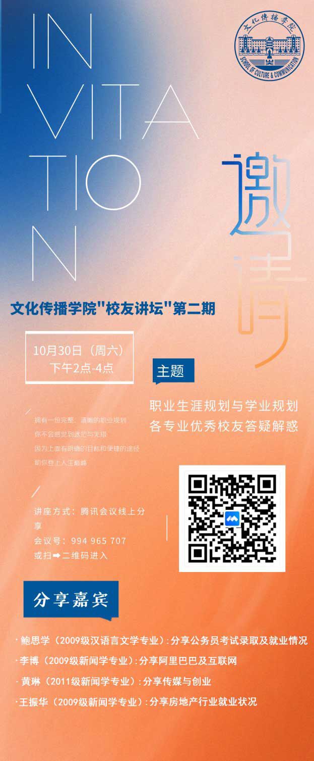 李博:2009级新闻学专业学生,现就职于阿里巴巴,从事阿里云产品运营专家工作。本科期间曾获过校十佳大学生、校长奖学金、国家奖学金、省级优秀学生干部等荣誉。后保送至浙江大学新闻与传播专业,毕业后入职阿里巴巴企业,供职至今。