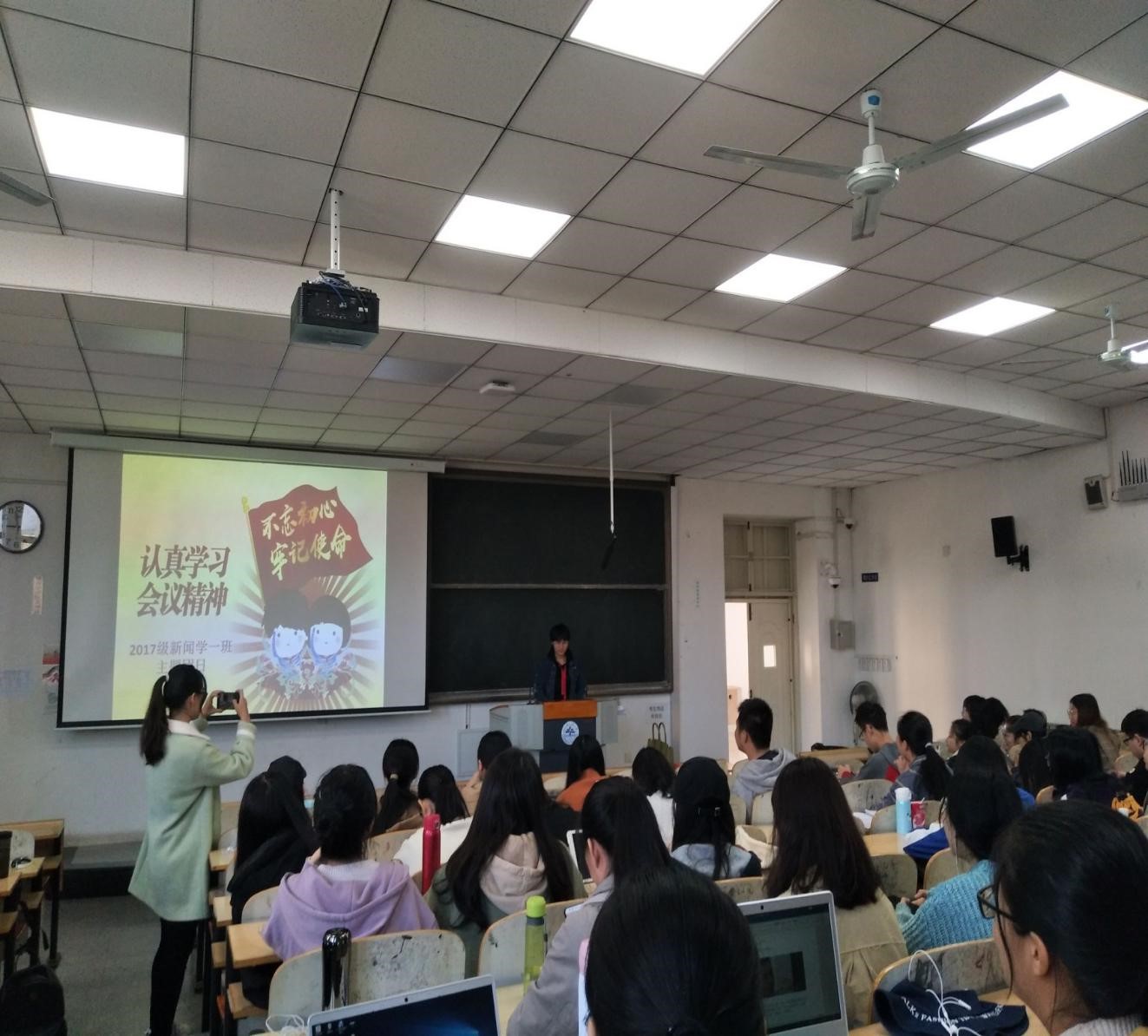 本站讯 10月30日上午,beat3652017级新闻学一班在图东114开展主题团日活动,召开“不忘初心、牢记使命”主题班会。班会由团支书蔡维佳担任主讲人,新闻学一班全体同学参与了此次班会。