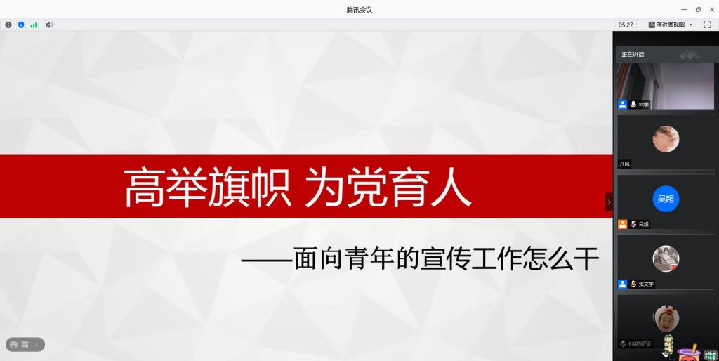 本站讯 11月2日晚,由威海校区学生媒体中心主办的新媒体成长训练营专题讲座《高举党旗,为党育人——面向青年的宣传工作怎么做》于腾讯会议线上举行。南平团市委宣传部长、共青团中央、福建团省委青年讲师团成员林檬担任主讲人,校区学生媒体中心指导老师张文学担任主持人。beat365唯一官方网站学生传媒中心全体学生参与本次活动。