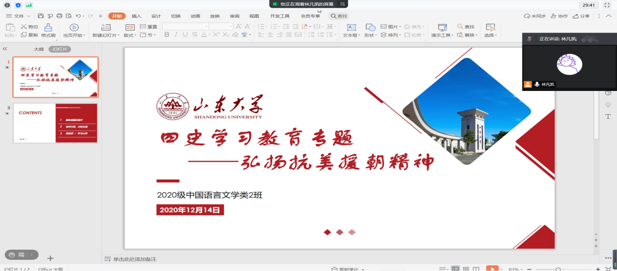 本站讯 12月14日晚,为贯彻落实习近平总书记在纪念中国人民志愿军抗美援朝出国作战70周年大会上的重要讲话精神,深入开展“四史”学习教育,2020级中文二班通过腾讯会议举行抗美援朝精神集体学习会,班长林凡凯担任主持人,全班同学参与会议。