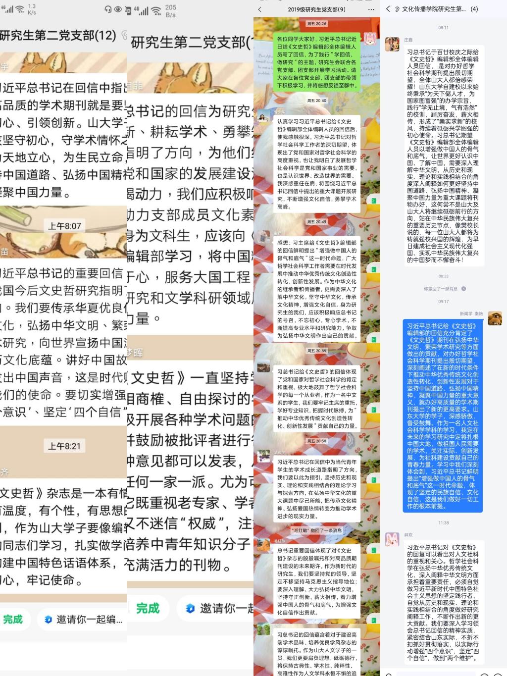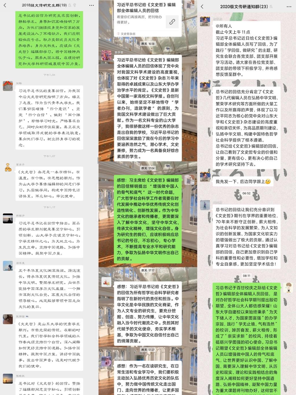 全体研究生认真学习领悟了习近平总书记给《文史哲》编辑部的重要回信精神。习近平总书记在给《文史哲》编辑部回信中肯定了《文史哲》70年来的办刊成就以及编辑部人员的工作努力,并提出“深入理解中华文明,从历史和现实、理论和实践相结合的角度深入阐释如何更好坚持中国道路、弘扬中国精神、凝聚中国力量”的重大课题与办刊方向。全体研究生成员深受震撼与鼓舞,围绕回信分享交流了学习体会。在读信感想中,研究生纷纷表示,一定认真贯彻落实回信精神,不负总书记殷切期盼与嘱托。作为人文社会科学研究领域的新生力量与潜在主力,研究生应自觉继承中华传统文化基因,增强文化自觉与自信,融学术创新与文化建设于一体,以高昂的学术志向与扎实的学术能力推进中华文化创造性转化、中华文明创新性发展。不少研究生在读信感想中为积极落实回信精神建言献策,得到其他分享者的支持与肯定。本次“学回信,做研究”活动在全体研究生的参与及热议中结束。