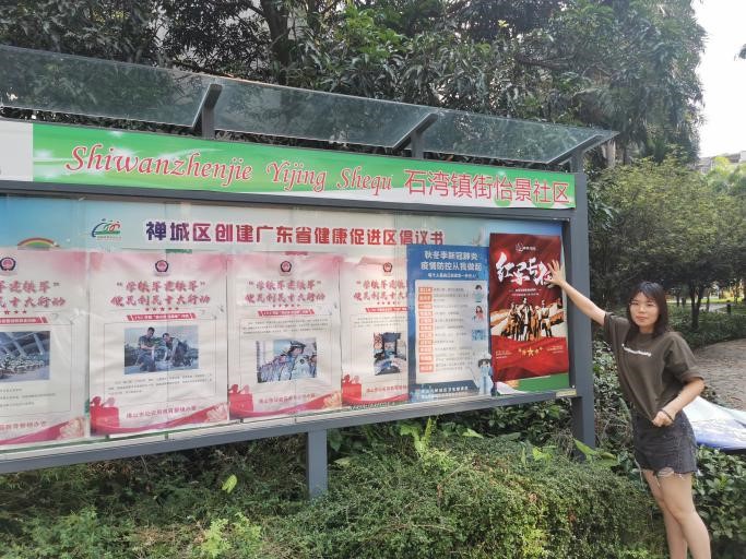 (图为团队成员李昱莹在广东省佛山市禅城区石湾街道怡景社区实践情景)