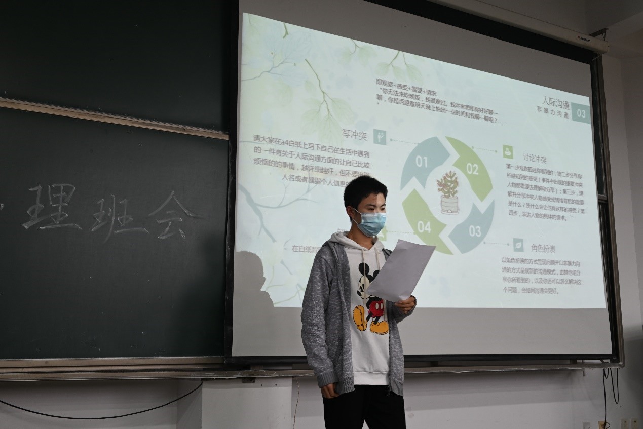 本次心理班会围绕人际沟通展开,由语言沟通的重要性、人际沟通的双向性、非暴力沟通理论、总结与展望四个部分组成。在第一部分的讲解中,赵长啸阐述了语言沟通的重要性,总结了语言沟通的五大作用与语言情景在日常交往中的重要性。宁竹金通过开展“你说我画”的活动,以寓教于乐的形式展开第二部分的讲解。两名同学上台详细描述图片,以便同学们能够根据描述绘制图画。该环节有利于同学们在轻松愉快的氛围中加深对于人际沟通的双向性的理解。在为表现优秀的同学分发奖品后,赵长啸开始宣讲第三部分的内容,以视频与幻灯片结合的方式向大家介绍了非暴力沟通模式,随后引导同学们完成了班级心理手册的制作。在这一环节,同学们通过交换问题、为其他同学的问题提供解决方法的方式使同学们体验非暴力沟通模式。总结与展望环节中,宁竹金结合自身实际,对本次心理班会进行了总结。最后,两名心理委员组织本班同学填写了心理班会反馈表。